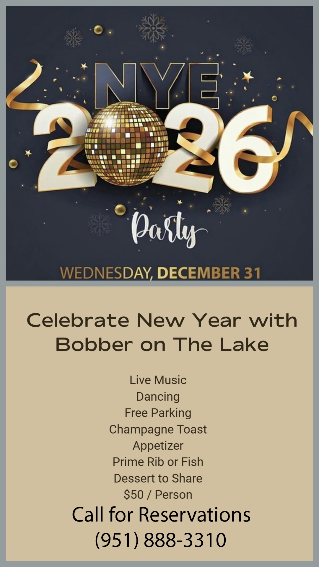 Experience delicious BBQ and Burgers at Lake Elsinore's favorite BBQ restaurant and entertainment venue, Bobber on the Lake, where great memories are made with family and friends. Enjoy Live music, karaoke, open mic, Sunday Football, and Monday Night Football!