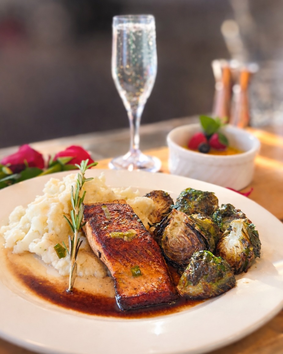 Join us on Valentine's Day for the perfect romantic evening! Live Entertainment & Pre Fixe Four Course Menu. Appetizer to Share: Shrimp Cocktail or Caprese Skewers; Salad: Mixed Greens or Cesar; Entree: Smoked Prime Rib or Pan Seared Salmon; Dessert to Share: Creme Brulee or White Chocolate Dipped Strawberries - $125 for Two